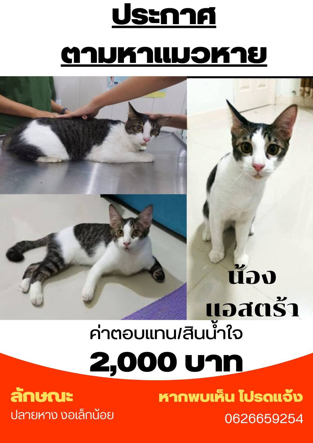 อายุ 6 ปี 5 เดือน ขนาด เล็ก (ต่ำกว่า 11 กก.) สี สีขาว หางกุดสีส้ม มีแต้มสีส้มที่จมูก