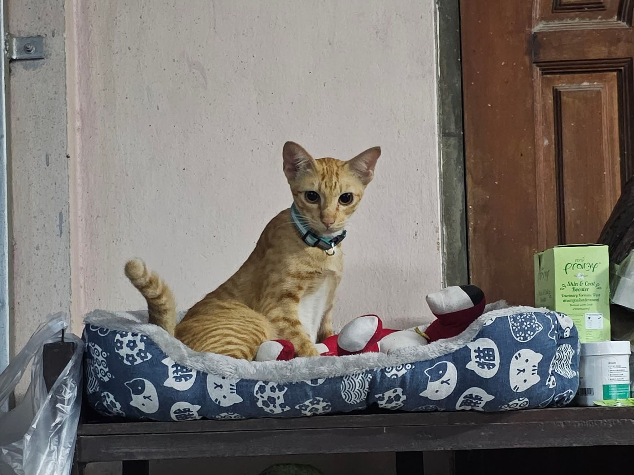 อายุ 8 เดือน ขนาด เล็ก (ต่ำกว่า 11 กก.) สี สีส้มเข้ม ลายสลิดชัด มีถุงเท้าสีขาวเล็กๆ ทั้ง 4 เท้า ท้องขาว คอขาว หางตรง