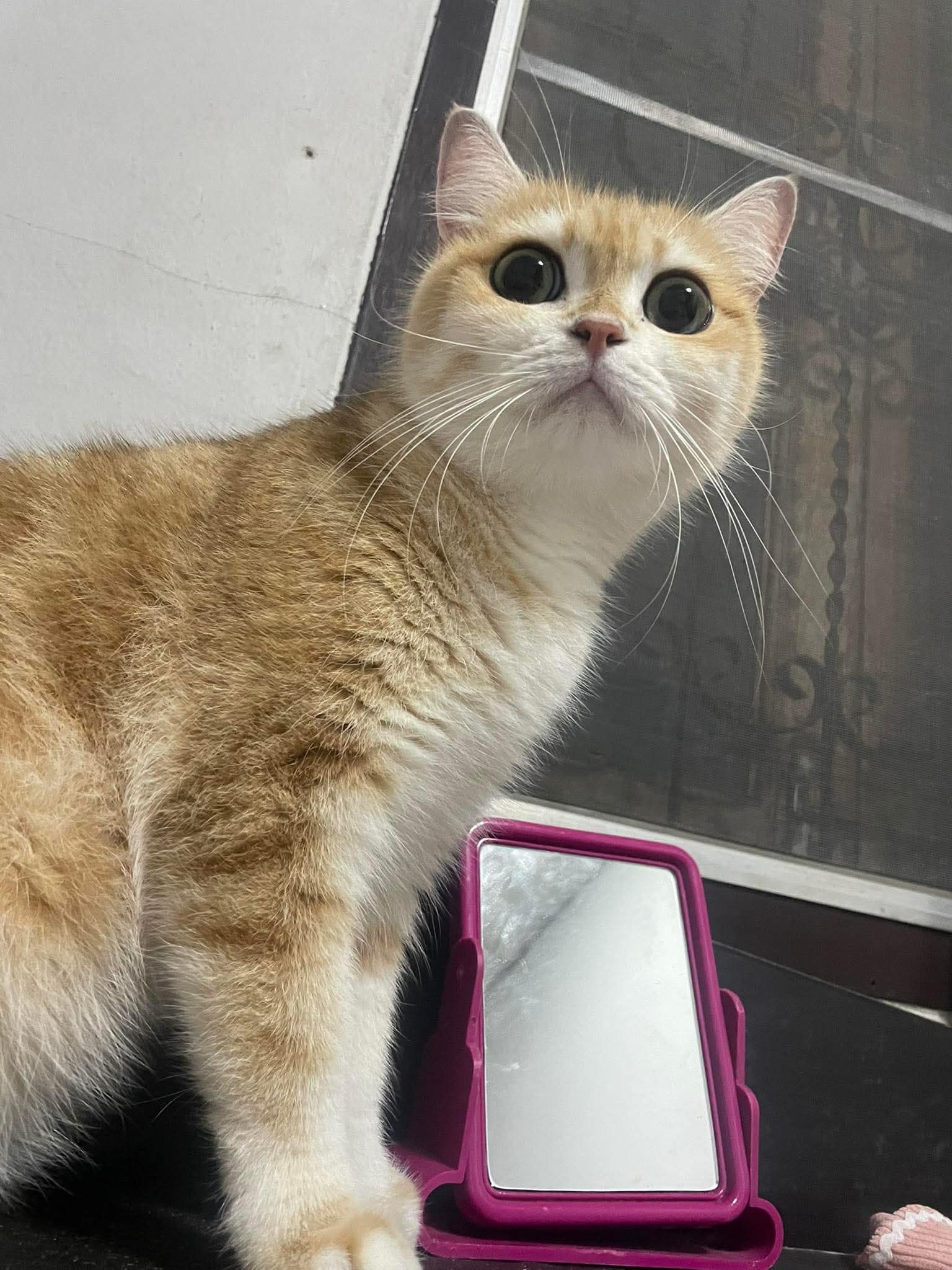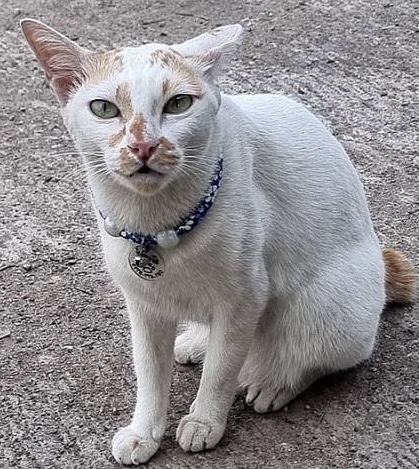 อายุ 6 ปี 5 เดือน ขนาด เล็ก (ต่ำกว่า 11 กก.) สี สีขาว หางกุดสีส้ม มีแต้มสีส้มที่จมูก