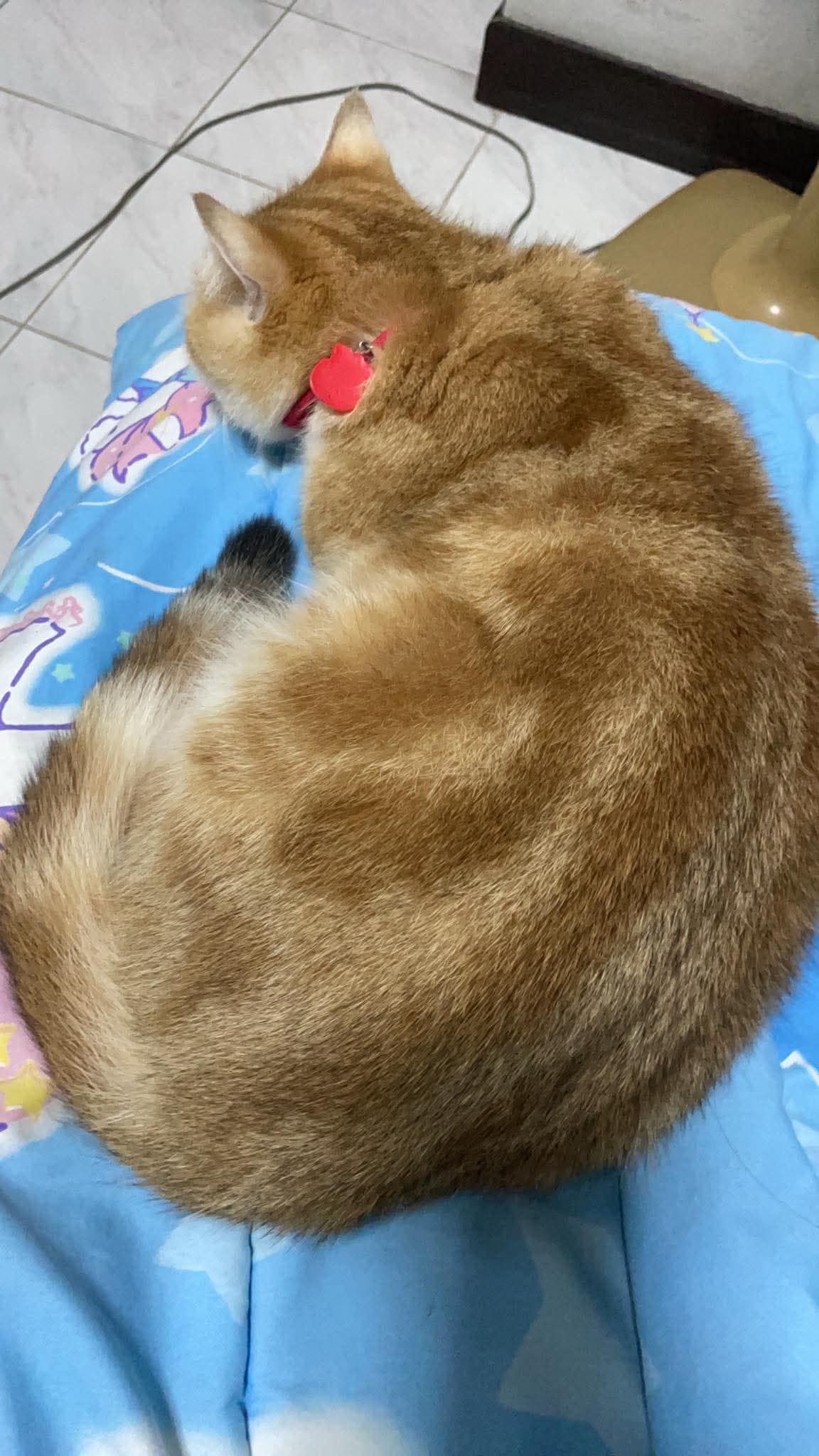 อายุ 8 เดือน ขนาด เล็ก (ต่ำกว่า 11 กก.) สี สีส้มเข้ม ลายสลิดชัด มีถุงเท้าสีขาวเล็กๆ ทั้ง 4 เท้า ท้องขาว คอขาว หางตรง